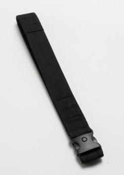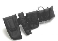 The belt has a tri-lock buckle and has: a double mag pouch, pistol holster, glove pouch, baton/torch holder, key keeper and handcuff pouch.
